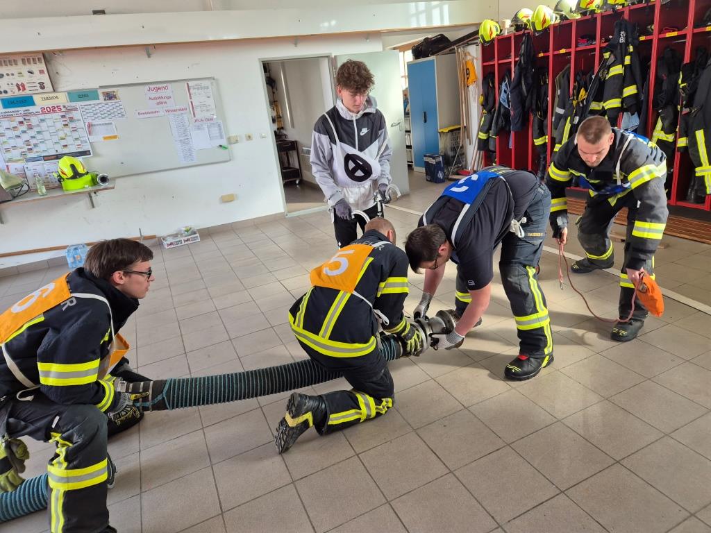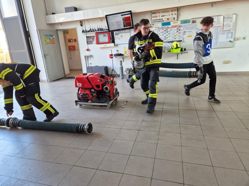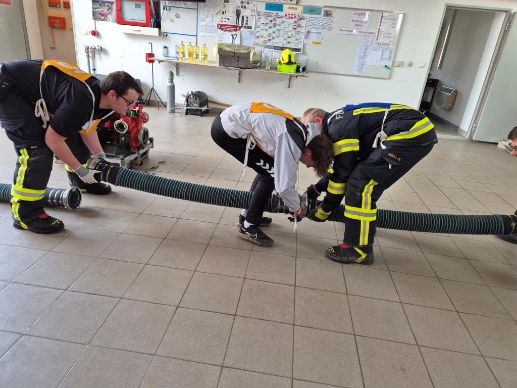 Gemeinsam mit anderen ist es ein wichtiger Prüfungsteil beim Jugendleistungsabzeichen Gold eine Saug- und Zubringleitung - vom Saugkorb bis zum Verteiler - herstellen zu können. Dabei wird unser Teilnehmer mit Teilnehmern von anderen Jugendgruppen zusammenarbeiten um dieses Ziel zu erreichen. Am Samstag wurde dies mit einigen aktiven Kameraden geübt, um die letzten Feinheiten und Abläufe noch einzuüben.