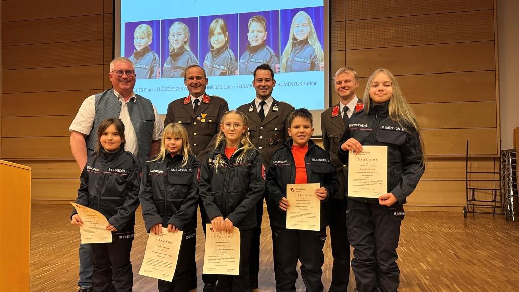 Angelobt wurden die Jugendfeuerwehrmitglieder Duscher Clara, Knödelseder Aaliyah, Schneider Luise, Sedlmayer Tristan und Humenyuk Karina.
