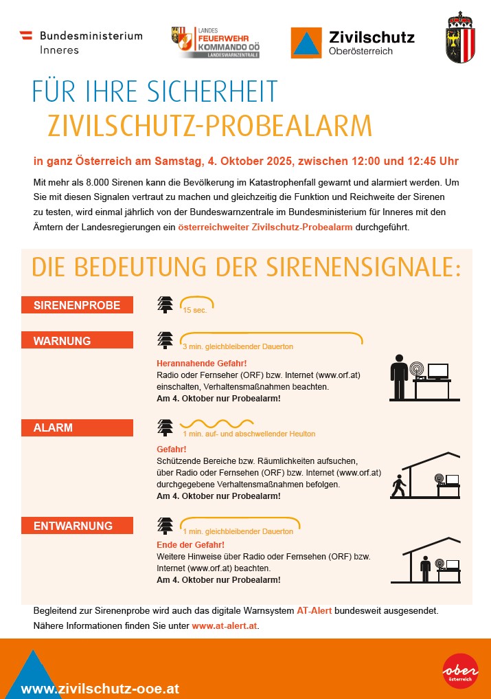 Pünktlich am 1. Samstag im Oktober um 12:00 Uhr - 12:15 Uhr - 12:30 Uhr - 12:45 Uhr wird der Zivilschutz-Probealarm in ganz Österreich ausgelöst.