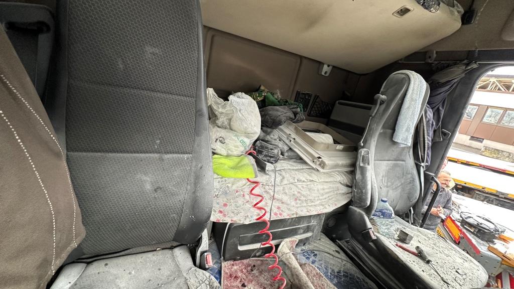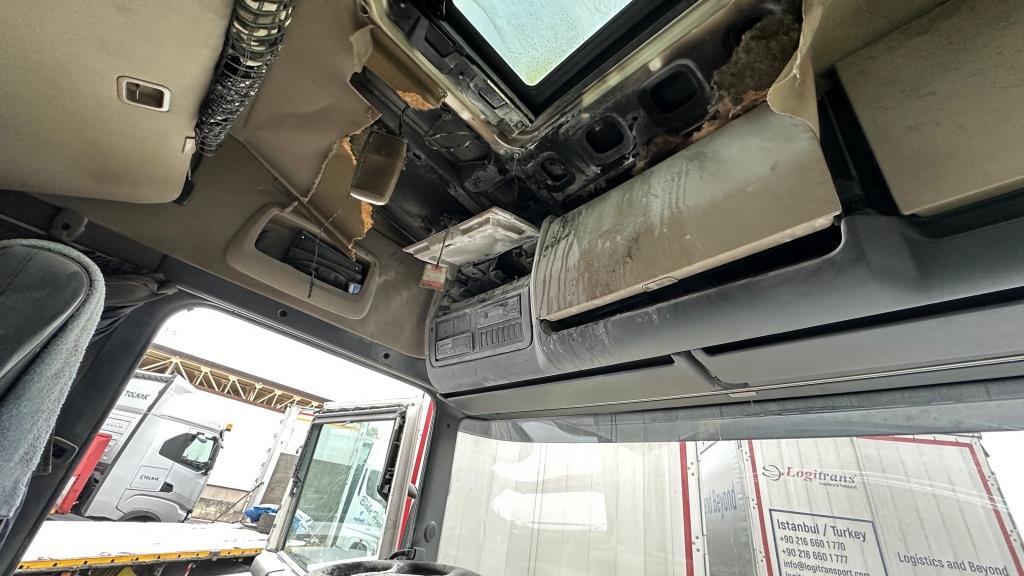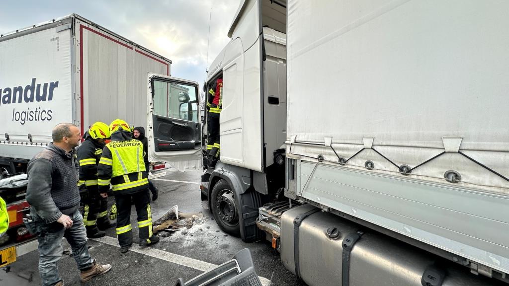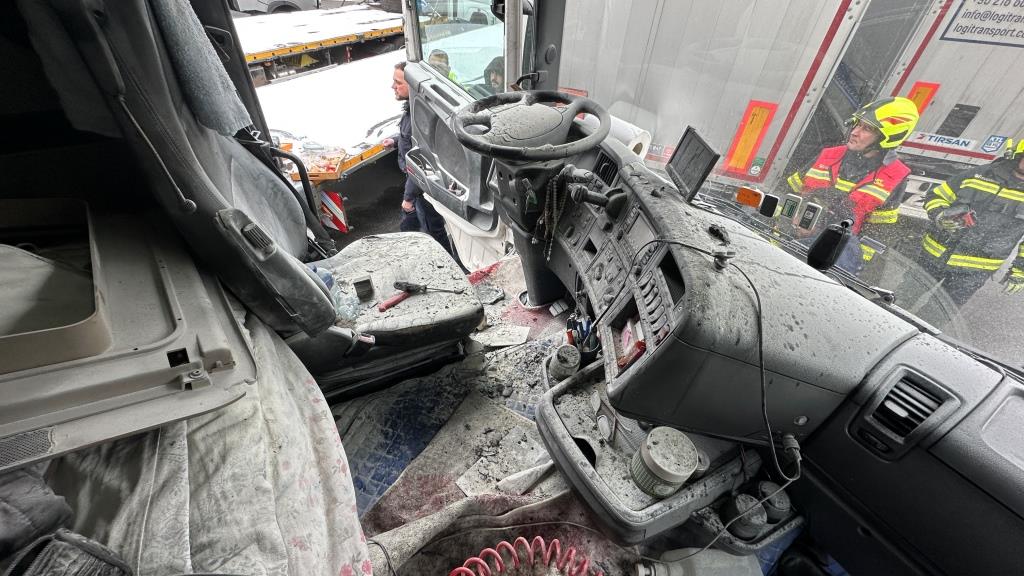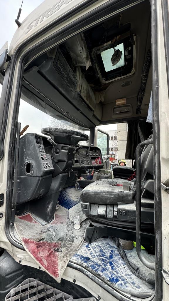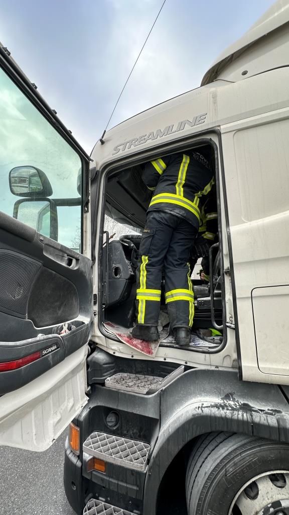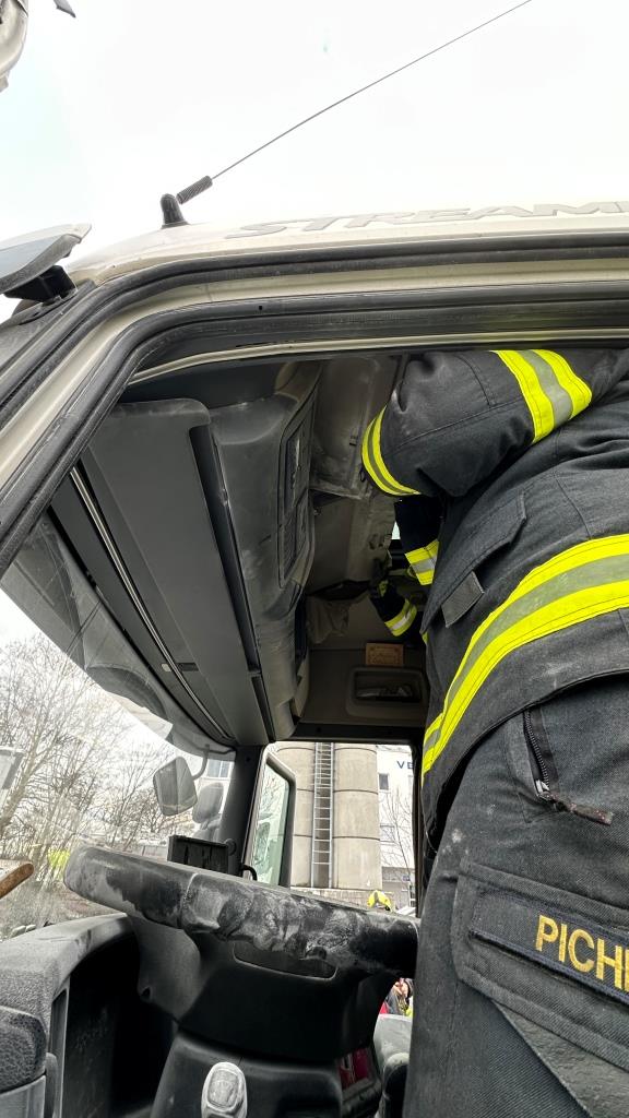 Brand bei Eintreffen der Feuerwehr durch Fahrer gelöscht - Der Brand dürfte im Bereich Ablagefach über dem Lenkrad entstanden sein (Ursache unklar). Der Fahrer hatte bereits mit einem Pulverlöscher den Brand gelöscht und das Fach, die Verkleidung und div. Textilien aus der Fahrerkabine, welche brannten entfernt. Zusätzlich hatte er auch noch die Batterie des LKW abgehängt, da der Brand wie er selbst vermutete durch einen Kurzschluss von Kabeln entstanden war.