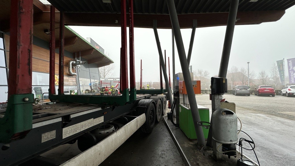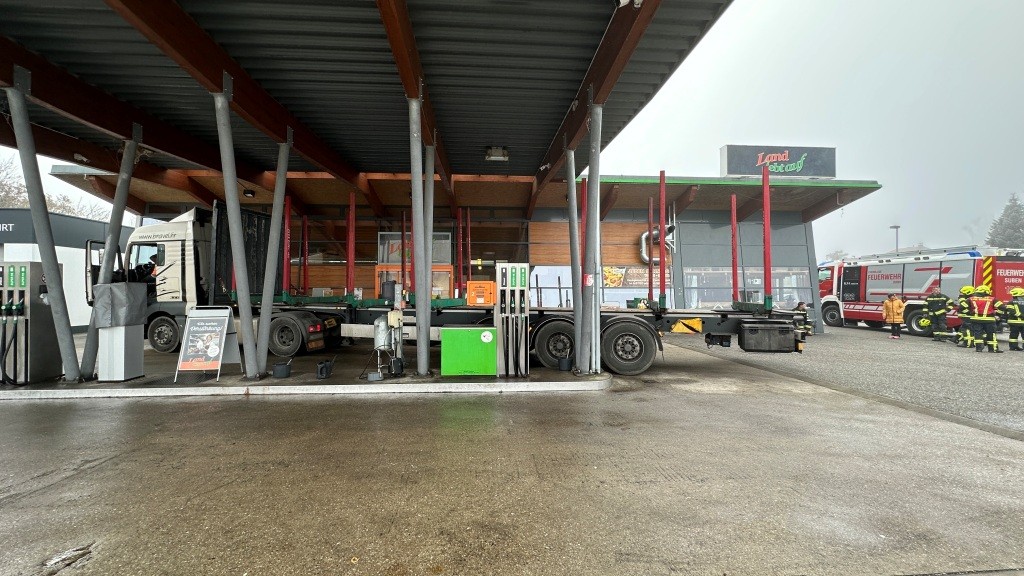Einsatzgrund war ein LKW, welcher beim Wenden auf der Tankstelle aufgrund seiner Größe zahlreiche Gegenstände streifte und beinahe das Dach der Tankstelle einriss. Glücklicherweise konnte der Fahrer noch angehalten werden bevor noch größerer Schaden entstand. Nach dem Eintreffen der Feuerwehr wurde unter Leitung der Polizei das Fahrzeug durch den Fahrer behutsam zurückgesetzt. So konnte weiterer Schaden verhindert werden. Einsatzende gegen 13:30 Uhr im Feuerwehrhaus.