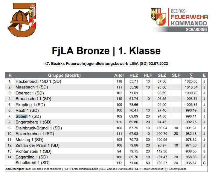 Die Kameraden der Feuerwehr Suben besonders die „Jugendbetreuer“ danken  der Jugendgruppe für die vielen Mühen beim Training und gratulieren zu den erbrachten Leistungen während der gesamten Bewerbssaison.