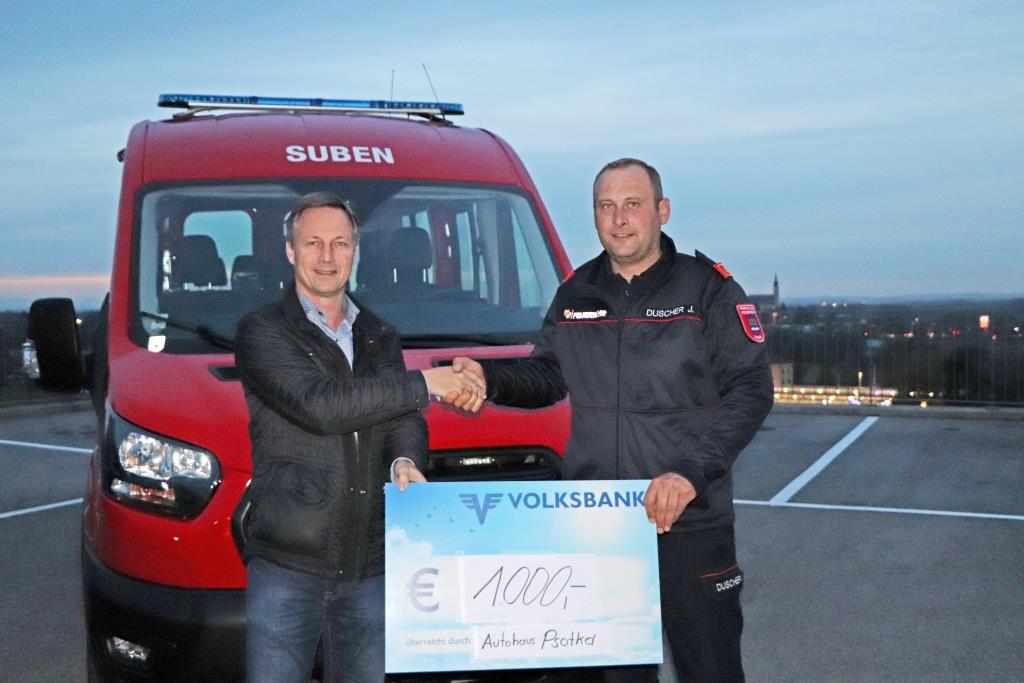 Spendenübergabe an die FF-Suben durch Reinhard Psotka (Ford Psotka - Schärding) - Am Mittwoch Abend wurde der Jugendgruppe der FF-Suben durch das Autohaus Ford Psotka in Schärding eine Spende von € 1.000,-- für die Jugendgruppe übergeben.
